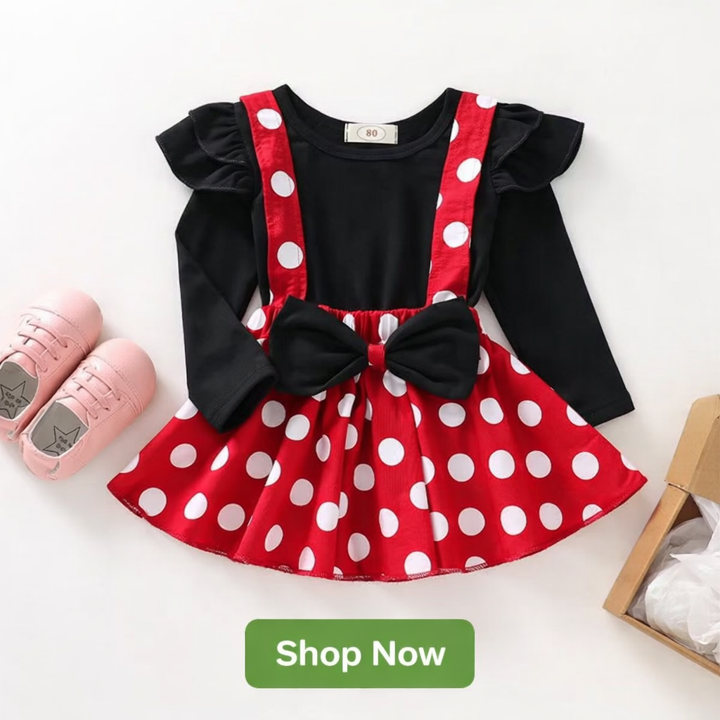 Add a dose of playful charm to your little one’s wardrobe with our “Mimi Magic” Polka Dot Suspender Dress Set. This adorable outfit features a soft black long-sleeve top with ruffle shoulders, paired with a vibrant red suspender skirt adorned with classic white polka dots. The oversized black bow at the waist adds a fun, cartoon-inspired twist. Perfect for themed parties, everyday dress-up, or just bringing a little magic to the day!
